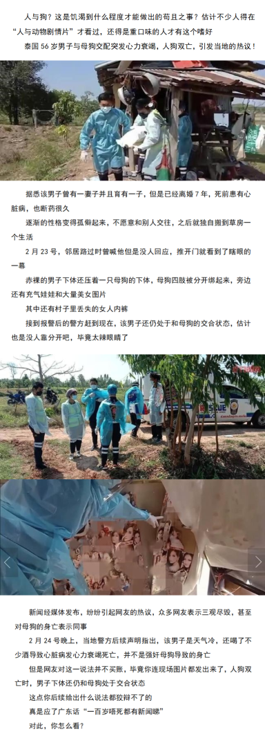 泰国男子与母狗交合致人狗双亡,
