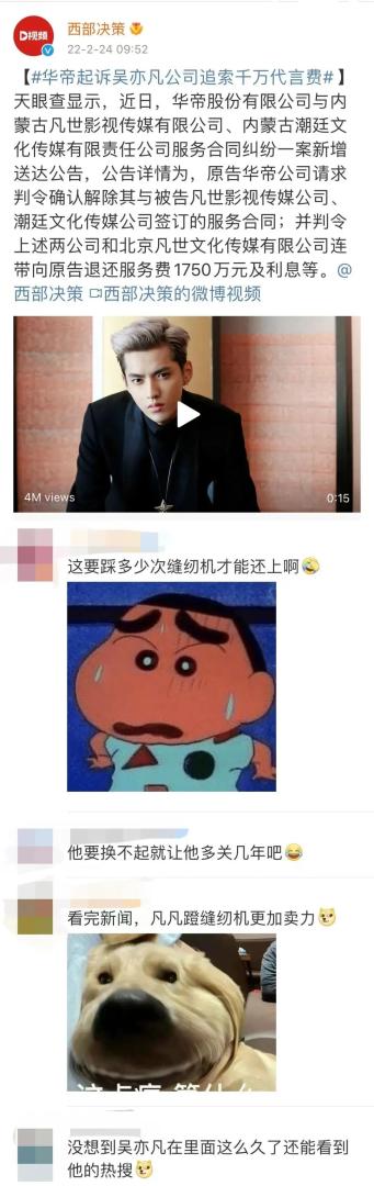 网曝吴亦凡需要赔偿1700多万代言费。